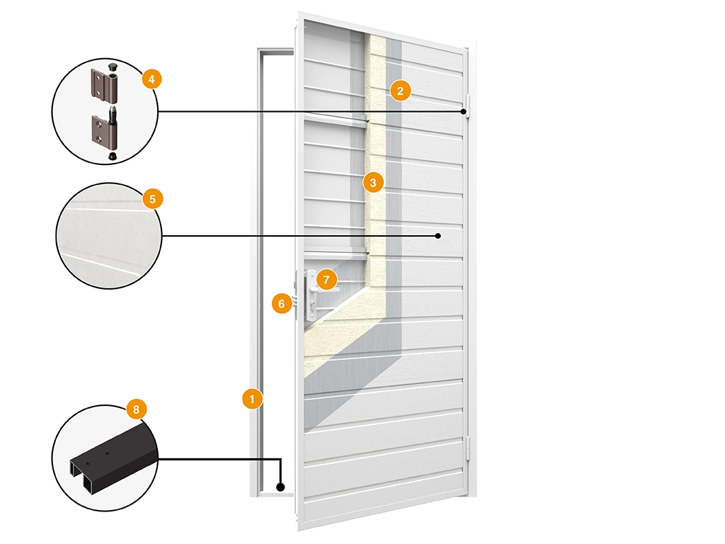 Дверное полотно изготовлено из оцинкованной стали, рама – из алюминия, так что конструкция не ржавеет. Дополнительную защиту от коррозии обеспечивает порошковое покрытие трех стандартных цветов. Заполнение – из пенополиуретана. Благодаря двухконтурному уплотнителю полотно плотно прилегает к раме, поэтому нет сквозняков и потери тепла. Двухсекционные петли, оснащенные износостойкими подшипниками, обеспечивают бесшумное и плавное открывание и закрывание.
